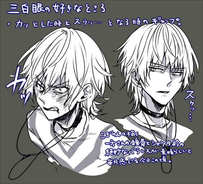 カッと見開いた時に更に小さくなる瞳とか、目を細めても白目の割合が多いところとか、いいよね三白眼。